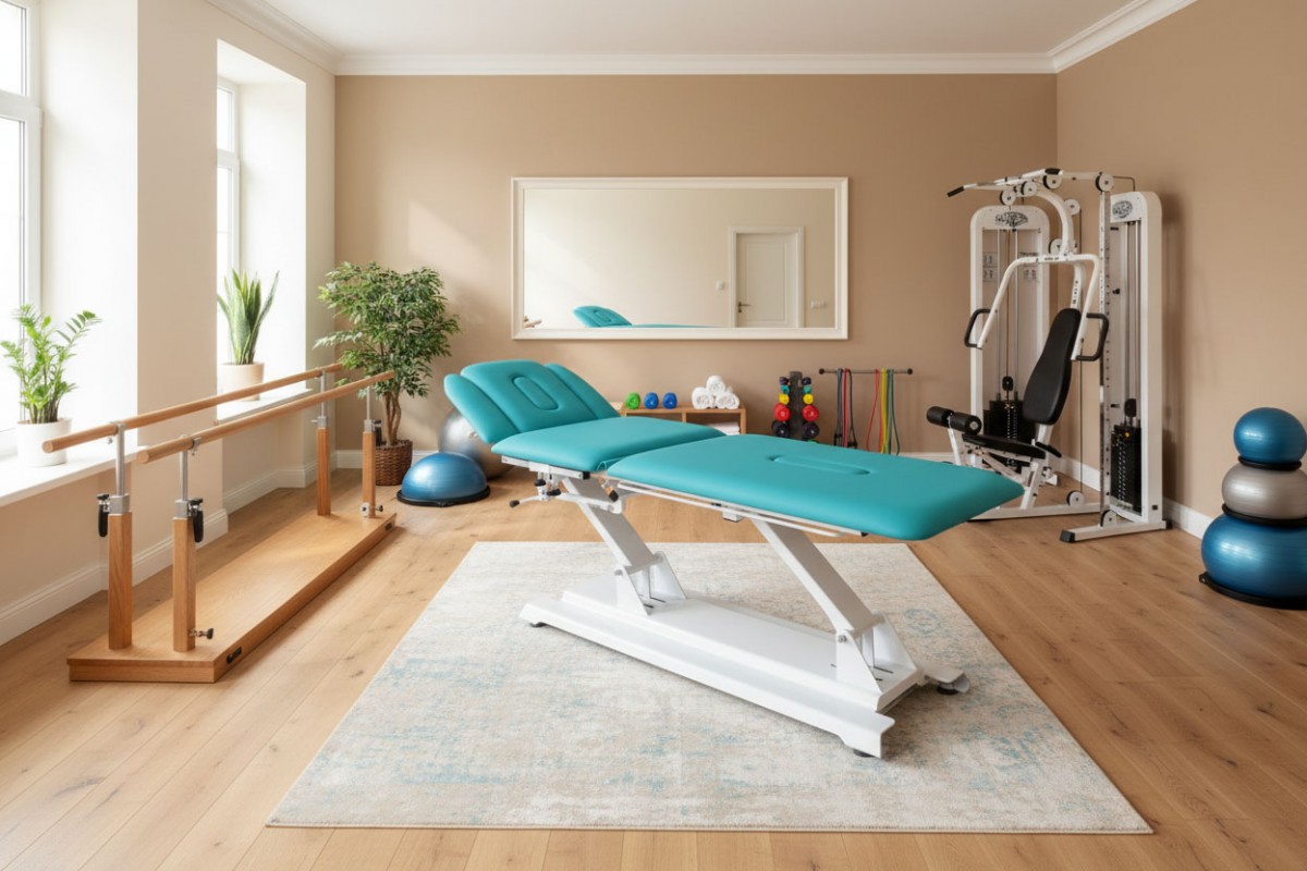 EVO F E ist ein dreiteiliges Modell der stationären Rehabilitationsliege mit der Liegefläche, die es ermöglicht, die Position eines Stuhles zu erreichen.